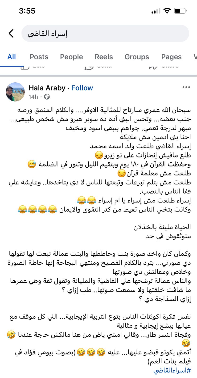 وذكر آخرون: ازاي إسراء القاضي طلعت راجل؟.