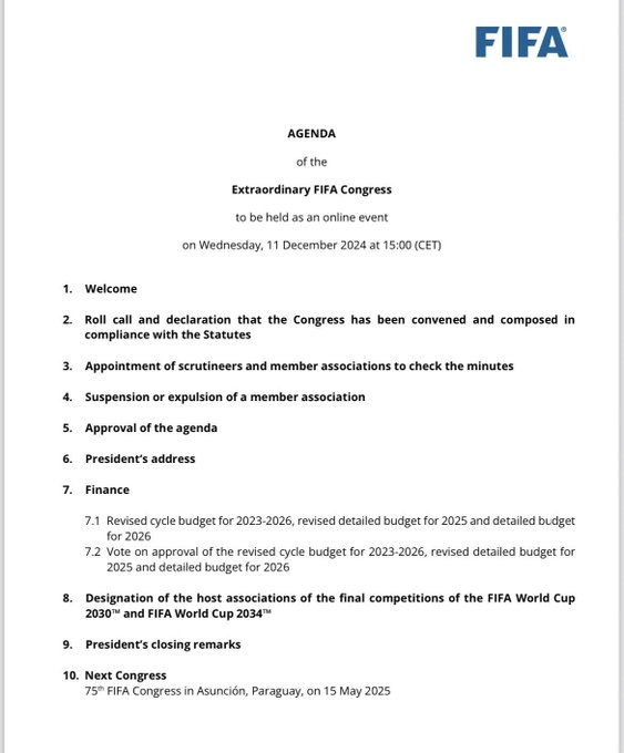 ووضع فيفا، بطولة كأس العالم 2034 ضمن جدول أعمال كونغرس الاستثنائي، الذي من المقرر إقامته 11 ديسمبر 2024، حيث سيعلن من خلاله البلد المستضيف لـ المونديال 2034.