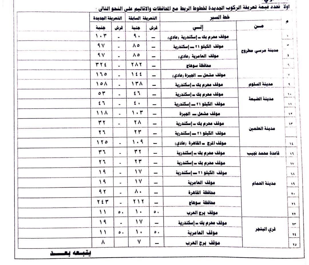 للمواطنين المتواجدين في مناطق الجيزة، يبلغ سعر مواصلات مرسى مطروح من الجيزة عند 165 جنيه، بعد قرار لجنة التسعير في شهر يوليو الماضي بتحريك أسعار الوقود مما أدى إلى ارتفاع أسعار التعريفة القديمة، التي كانت مقدرة بمبلغ 144، وفقا لما أعلنته المحافظة عبر المنشور الخاص بالتعريفات الجديدة.