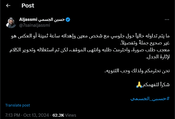 رد الجسمي، على هذه المزاعم عبر حسابه على منصة إكس، قائلا: ما يتم تداوله حاليا حول جلوسي مع شخص معين وإهدائه ساعة ثمينة أو العكس هو غير صحيح جملة وتفصيلا، معجب طلب صورة، واحترمت طلبه وانتهى الموقف، لكن تم استغلاله وتحوير الكلام لإثارة الجدل، نحن نحترمكم ولذلك وجب التنويه.