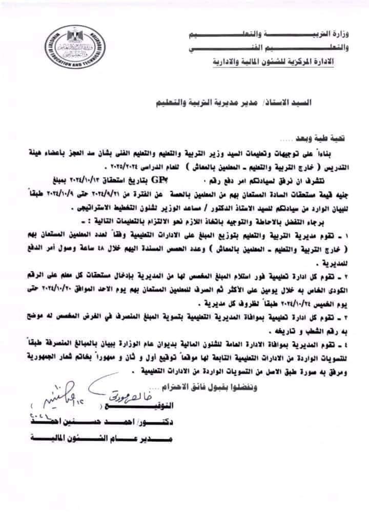 - تقوم كل إدارة تعليمية فور استلام المبلغ المخصص لها من المديرية بإدخال مستحقات كل معلم على الرقم الكودي الخاص به خلال يومين على الأكثر ثم الصرف للمعلمين المستعان بهم يوم الأحد 20 أكتوبر 2024 حتى يوم الخميس 24 أكتوبر 2024 طبقًا لظروف كل مديرية، ووتقوم كل إدارة تعليمية بموافاة المديرية التعليمية بتسوية المبلغ المتصرف في الفرض المخصص له موضح به رقم الشطب وتاريخه.