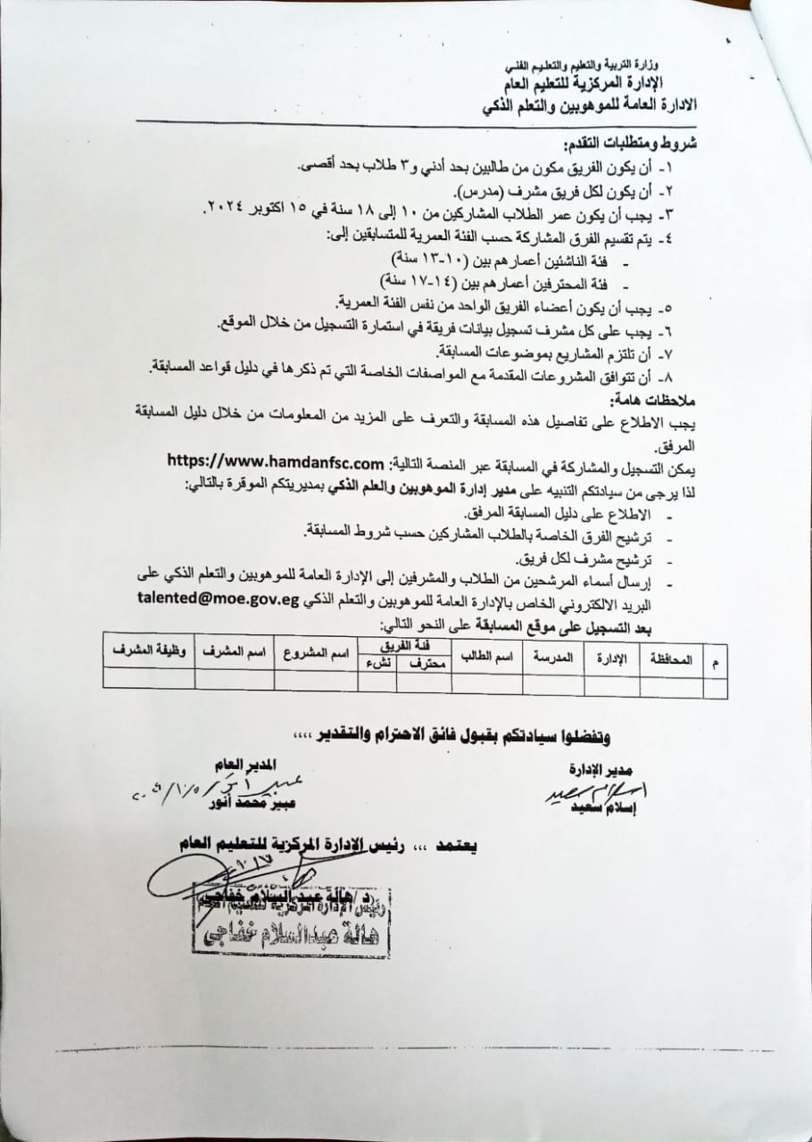 وجهت وزارة التربية والتعليم والتعليم الفني، خطابًا إلى المديريات التعليمية، موضحة أنه بناء على إطلاق مسابقة تحدي علوم المستقبل التابعة للمنظمة العربية للتربية والثقافة والعلوم بالتعاون مع إحدى المؤسسات الإماراتية من شهر سبتمبر 2024 وحتى شهر فبراير 2025 في إطار تعزيز التعاون بين المنظمة واللجنة الوطنية العربية بهدف تشجيع الابتكار في مجال العلوم والتكنولوجيا، فإن مسابقة "تحدي علوم المستقبل هي منصة مسابقات تهدف إلى تعزيز مبادئ الذكاء الاصطناعي وإنترنت الأشياء وذلك من خلال التركيز على أساليب التعليم متعددة التخصصات للطلاب الموهوبين والفائقين في مجال العلوم والتكنولوجيا.