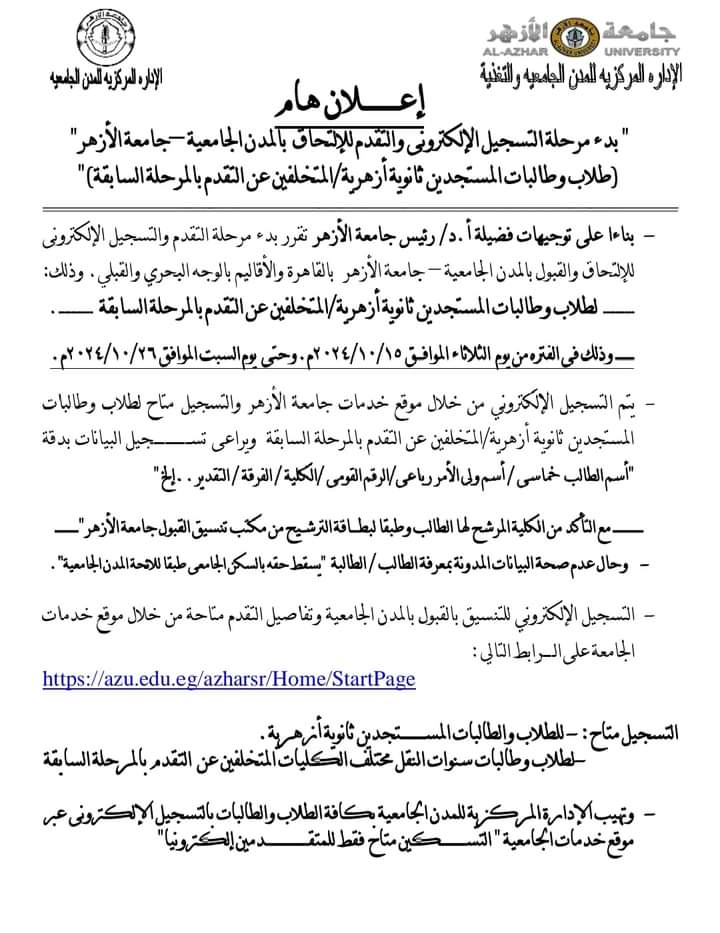 وتهيب جامعة الأزهر بكافة الطلاب والطالبات بالتسجيل الإلكتروني عبر موقع خدمات الجامعية التسكين متاح فقط للمتقدمين إلكترونيا.