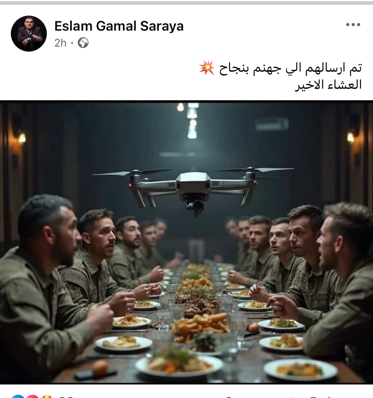 وتصدر هاشتاج العشاء الأخير قائمة التريند عبر فيسبوك، بسبب مشاركة جميع رواد السوشيال ميديا لصور العديد من الجنود الإسرائيليين أثناء لحظاتهم الأخيرة في العشاء داخل قاعة الطعام، قبل استهدافهم بشكل مباشر.