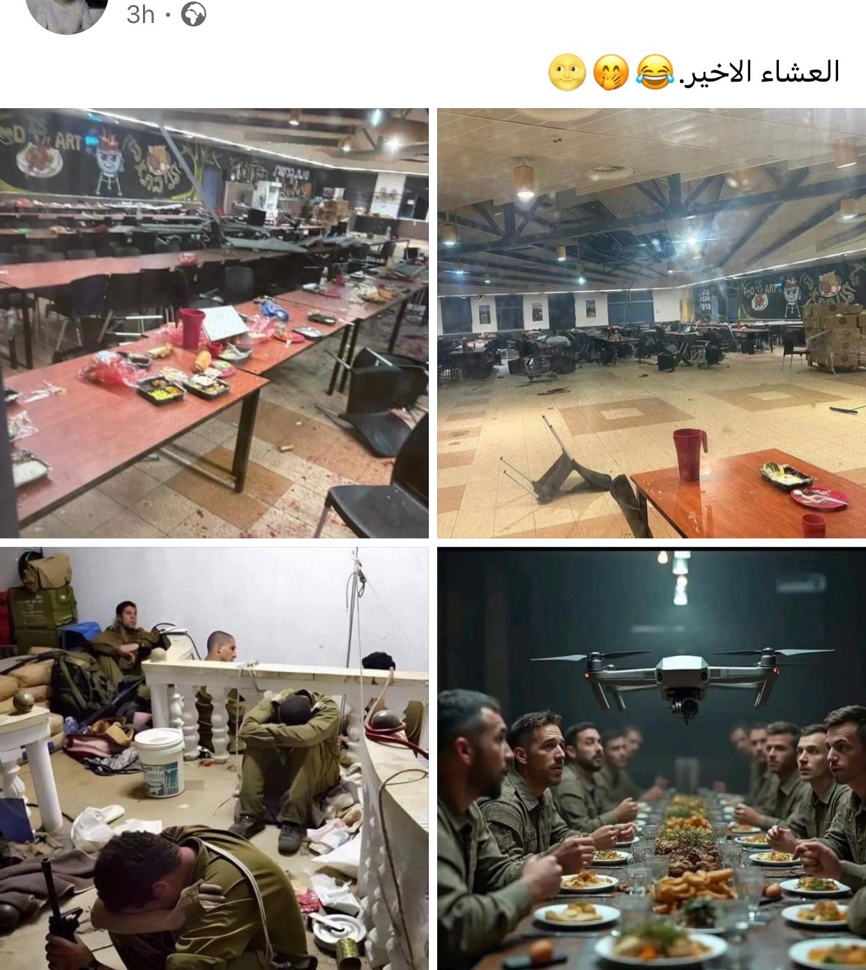 وتداولت صور الجنود الإسرائيليين عبر مواقع التواصل تحت "هذا هو العشاء الأخير لهم، حيث زعم رواد التواصل بـ منشورات، أبرزهم: العشاء الأخير قبل الذهاب إلى الجحيم، العشاء الأخير لجنود العدو، بالإضافة إلى العديد من التعليقات من قبل رواد منصات التواصل، إلى جانب بعض الصور التي تم صناعتها بالذكاء الاصطناعي، لخلق صور خيالية عن المشهد الذي دار بعد قتل الجنود الإسرائيليين.