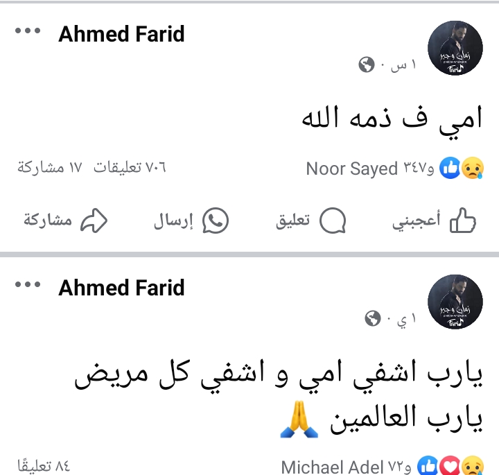 وكتب أحمد فريد، منشورًا عبر حسابه الشخصي بموقع التواصل الاجتماعي فيسبوك، وقال: أمي في ذمه الله، ومن ثم انهالت التعليقات بالدعاء والرحمة لوالدته.