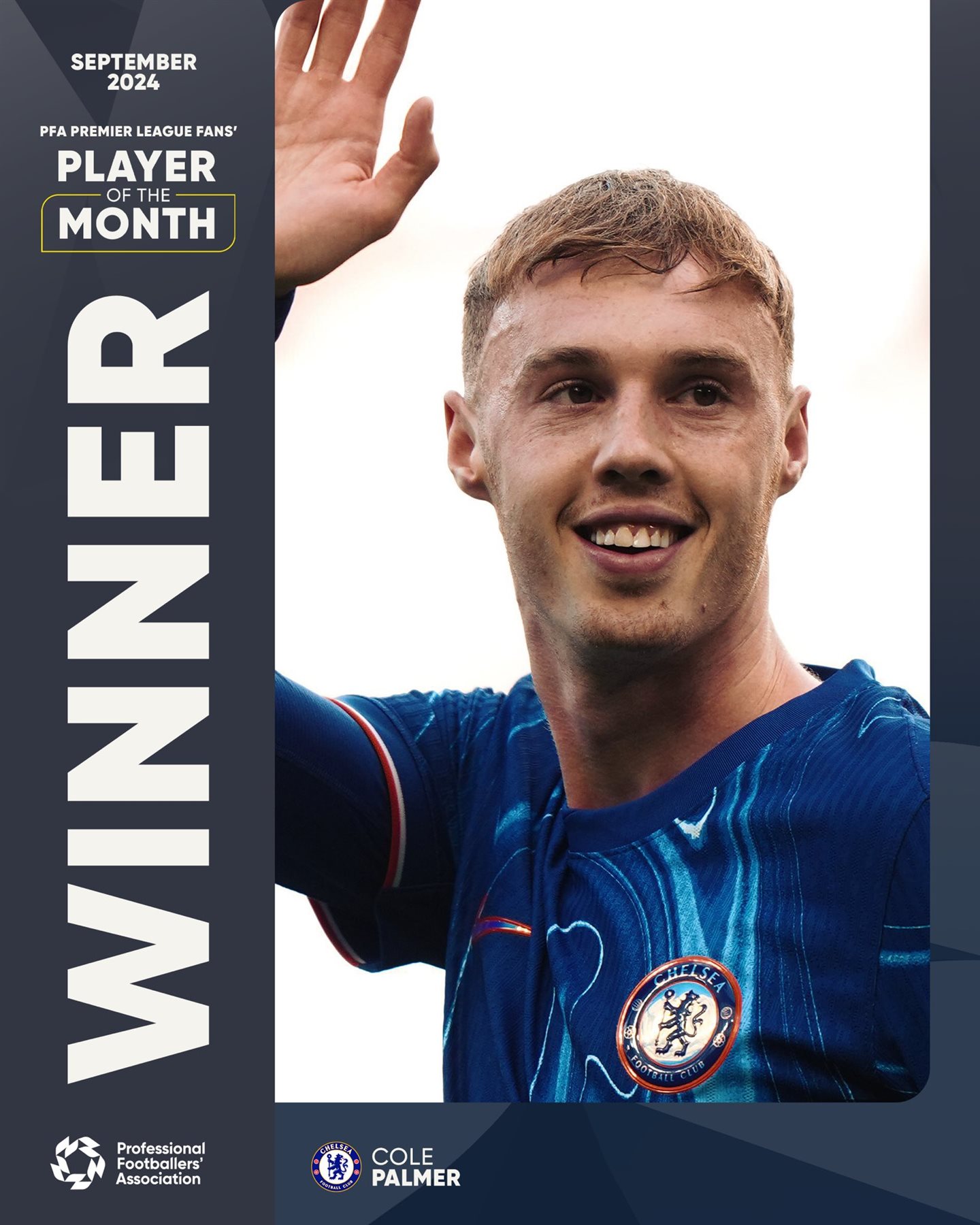 حصل اللاعب الإنجليزي كول بالمر نجم فريق تشيلسي على جائزة أفضل لاعب في الدوري الإنجليزي الممتاز في شهر سبتمبر من قبل رابطة اللاعبين المحترفين.