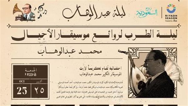 ينظم المستشار تركي آل الشيخ، رئيس الهيئة العامة للترفيه بالمملكة العربية السعودية، احتفالية خاصًة للموسيقار الراحل محمد عبد الوهاب، يوم 25 أكتوبر على مسرح أبو بكر سالم.