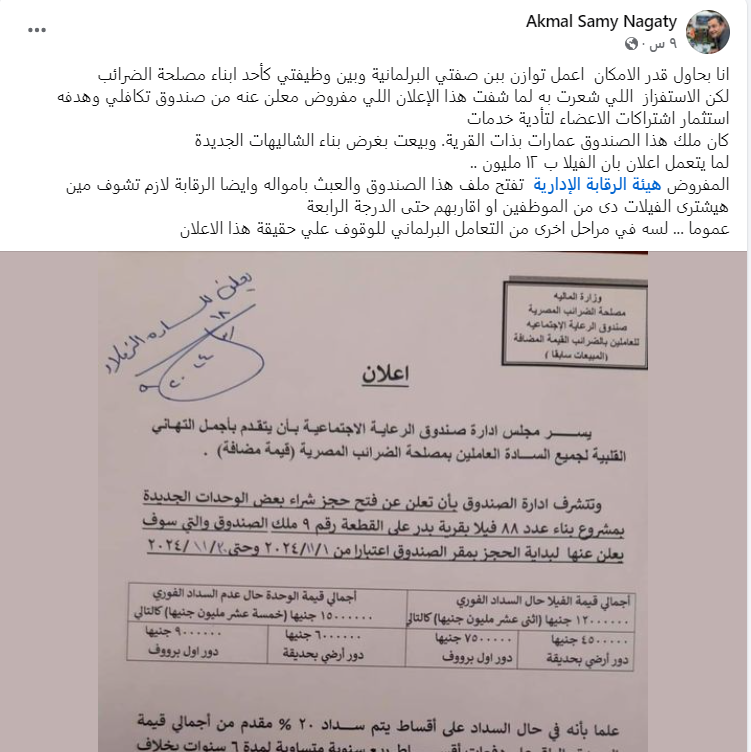 وبحسب المستند المرفق بمنشور النائب عبر صفحته على فيسبوك فقد جاء فيه: يُسر مجلس إدارة صندوق الرعاية الاجتماعية للعاملين بالضرائب بأن يتقدم بأجمل التهاني القلبية لجميع العاملين بمصلحة الضرائب المصرية قيمة مضافة، وتتشرف إدارة الصندوق بأن تعلن فتح حجز شراء بعض الوحدات الجديدة بمشروع بناء عدد 88 فيلا بقرية بدر على القطعة رقم 9 ملك الصندوق والتي سوف يعلن عنها لبداية الحجز بمقر الصندوق اعتبارا من 2024/11/1 وحتى 30 /11 / 2024.
