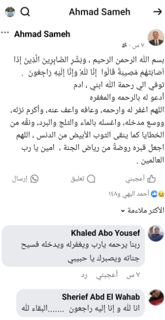 وقال أحمد سامح مدير مكتب المفتي: بسم الله الرحمن الرحيم، وَبَشِّرِ الصَّابِرِينَ الَّذِينَ إِذَا أَصَابَتْهُمْ مُصِيبَةٌ قَالُوا إِنَّا لِلَّهِ وَإِنَّا إِلَيْهِ رَاجِعُونَ، توفي الي رحمة الله ابني، ادم أدعو له بالرحمة والمغفرة اللهم اغفر له وارحمه، وعافه واعف عنه، وأكرم نزله، ووسع مدخله، واغسله بالماء والثلج والبرد، ونقِّه من الخطايا كما ينقى الثوب الأبيض من الدنس، اللهم اجعل قبره روضةً من رياض الجنة، امين يا رب العالمين.