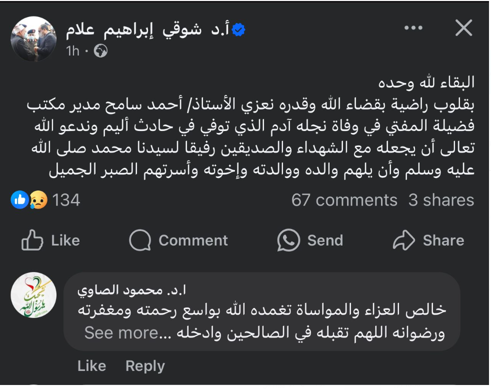 توفي منذ قليل، نجل أحمد سامح، مدير مكتب الدكتور نظير عياد، مفتي الجمهورية، في حادث سير أليم.
