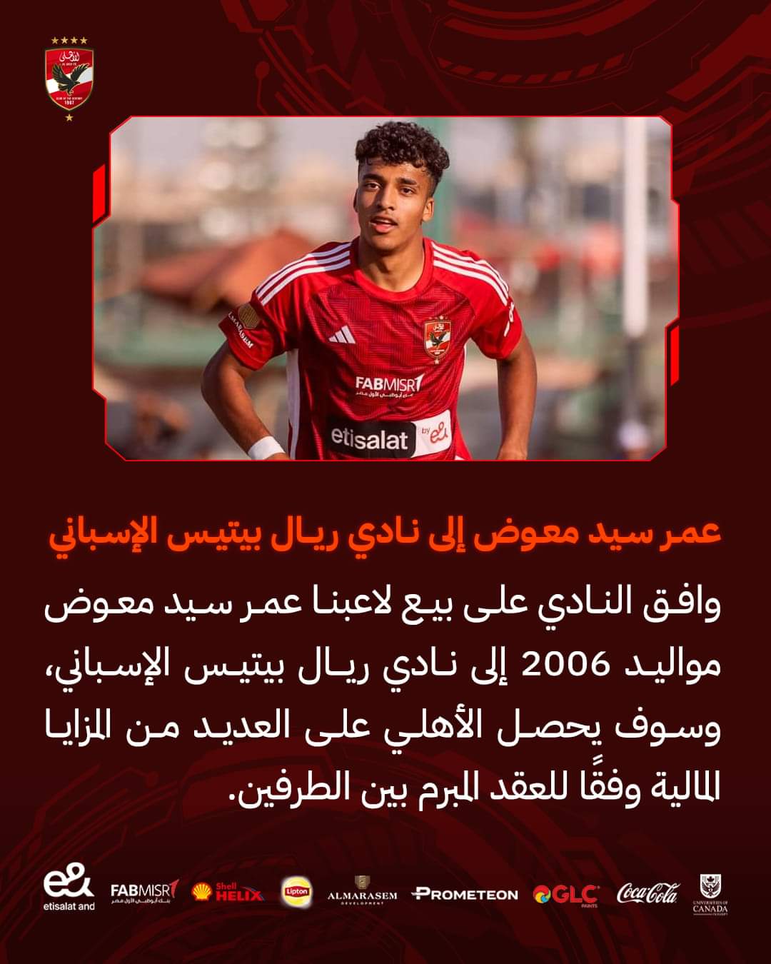 وكتب النادي الأهلي عبر موقعه الرسمي: وافق النادي الأهلي على بيع لاعبنا عمر سيد معوض مواليد 2006 إلى نادي ريال بيتيس الإسباني، وسيحصل الأهلي على العديد من المزايا المالية وفقا للعقد المبرم بين الطرفين.