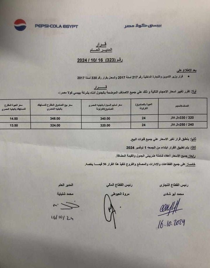 وحصل القاهرة 24، على نسخة من المستند الذي أرسلته الشركة إلى التجار والموردين، اليوم، حيث ارتفعت أسعار بيبسي كانز سعة 320/ 330 مل إلى سعر 14.5 جنيه للبيع للمستهلك، فيما ارتفع سعر بيع الصندوق الذي يحتوي على 24 عبوة للمستهلك إلى 348 جنيهًا.