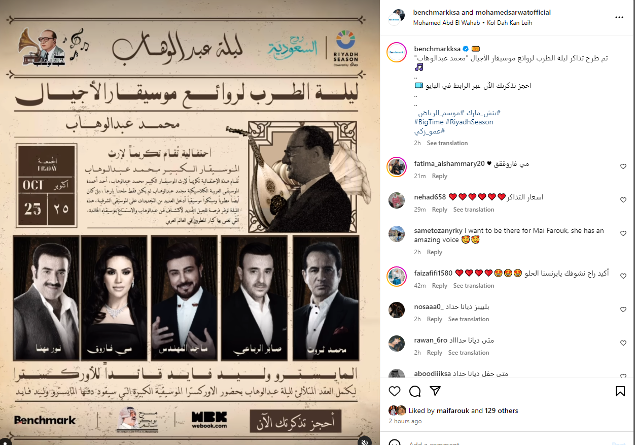 بعد طرح التذاكر.. التفاصيل الكاملة لـ حفل روائع الموسيقار محمد عبد الوهاب في موسم الرياض