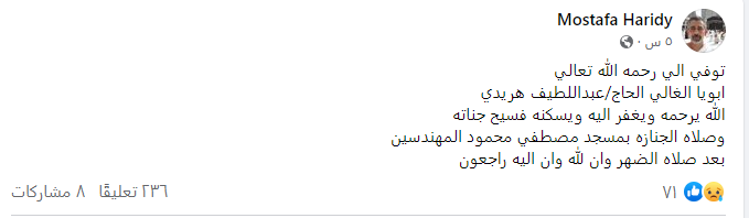 وكتبت مصطفى هريدي، منشورًا عبر حسابه الشخصي بموقع فيسبوك جاء فيه: توفي إلى رحمه الله تعالي، أبويا الغالي الحاج عبداللطيف هريدي، الله يرحمه ويغفر اليه ويسكنه فسيح جناته، وصلاة الجنازة، بمسجد مصطفي محمود المهندسين بعد صلاة الضهر وإن لله وإن إليه راجعون.