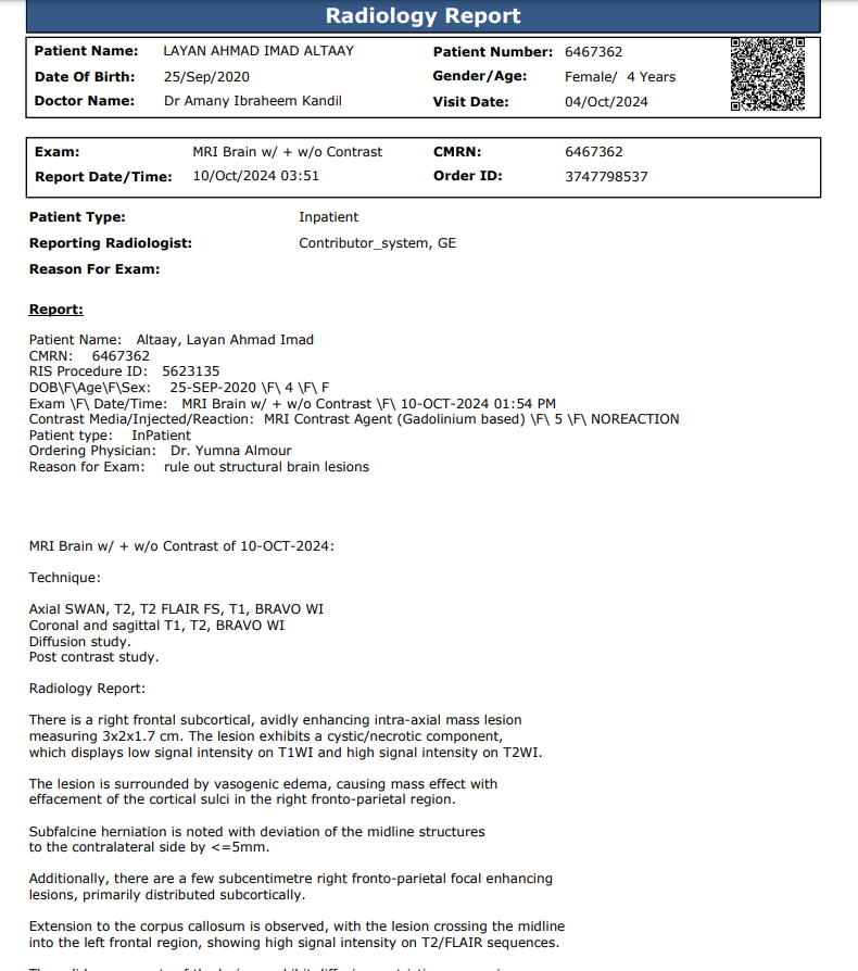 وأوضحت التقارير الطبية الخاصة بـ الطفلة ليان أحمد عماد الطائي بـ الفحوصات الأولية والتصوير بالرنين المغناطيسي للدماغ أنها تعاني من وجود كتلة في الدماغ يُشتبه في أنها ورم دبقي عالي الدرجة، وتلقت علاجًا بـ المضادات الحيوية ومضادات الفيروسات بعد استبعاد التهاب السحايا والتهاب الدماغ، لكن لم يكن هناك أي تاريخ لنوبات أو حالات عصبية سابقة في سجلاتها.