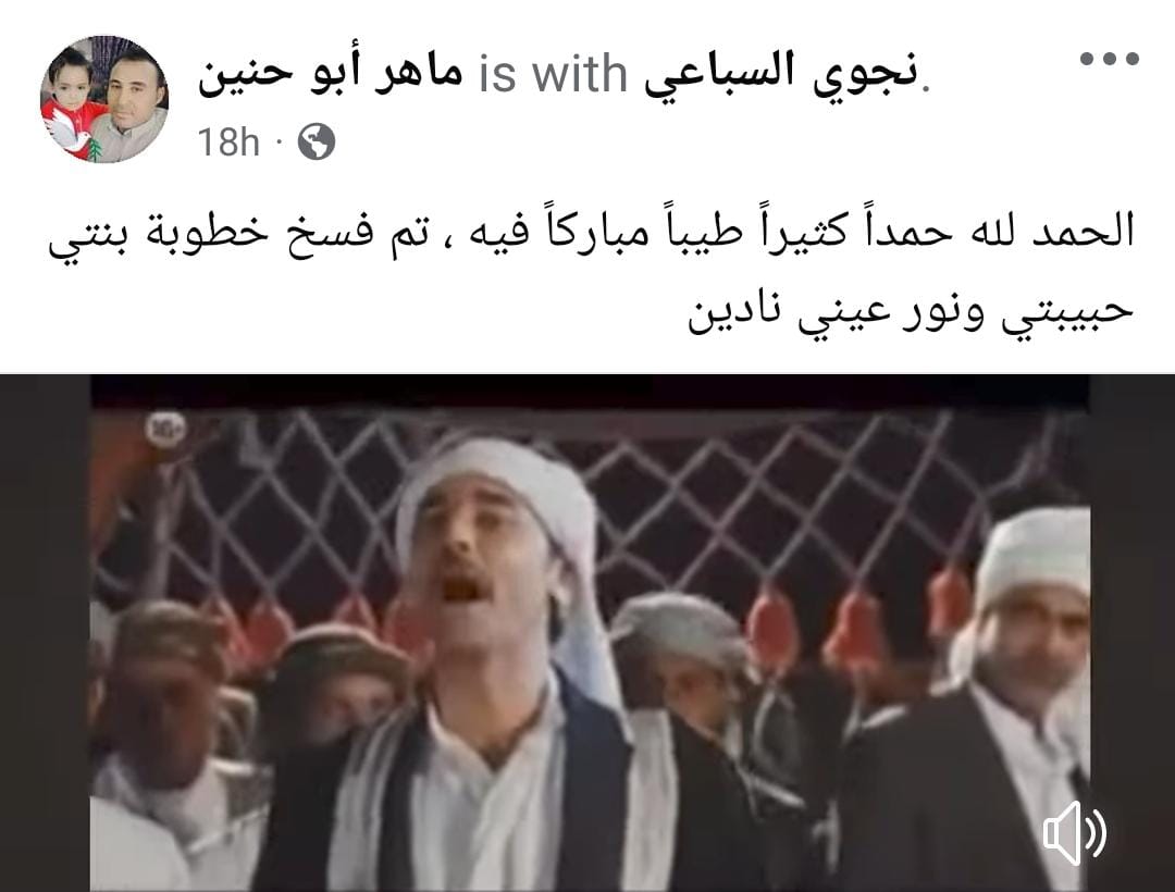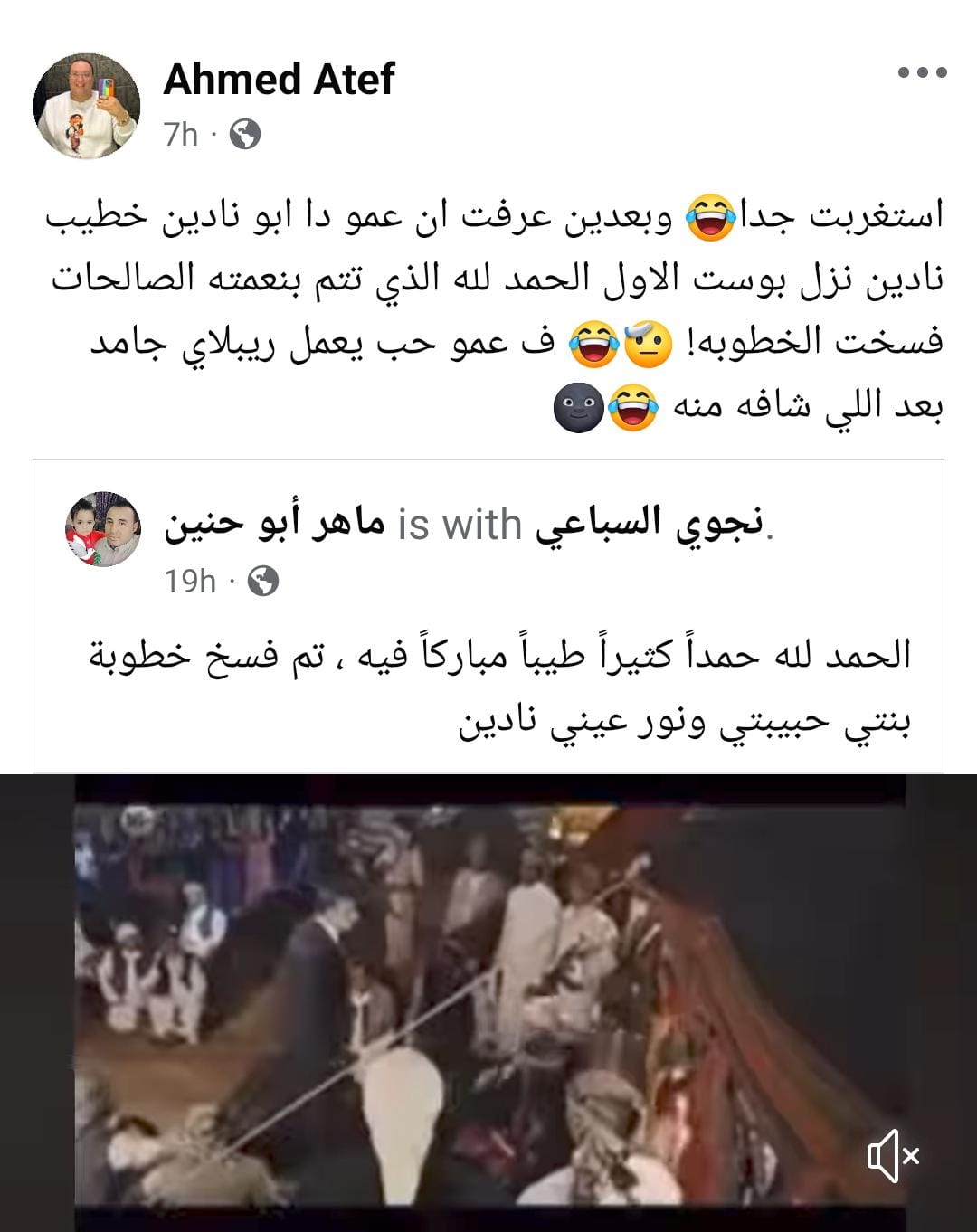 ونشر الأب مقطعا من فيلم المصلحة على حسابه بموقع فيس بوك للتواصل الاجتماعي، وعلق عليه: الحمد لله حمدا كثيرا طيبا مباركا فيه، تم فسخ خطوبة بنتي حبيبتي ونور عيني نادين.
