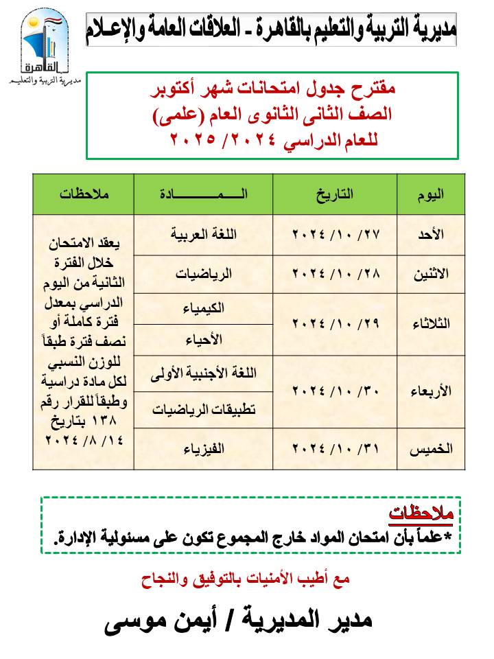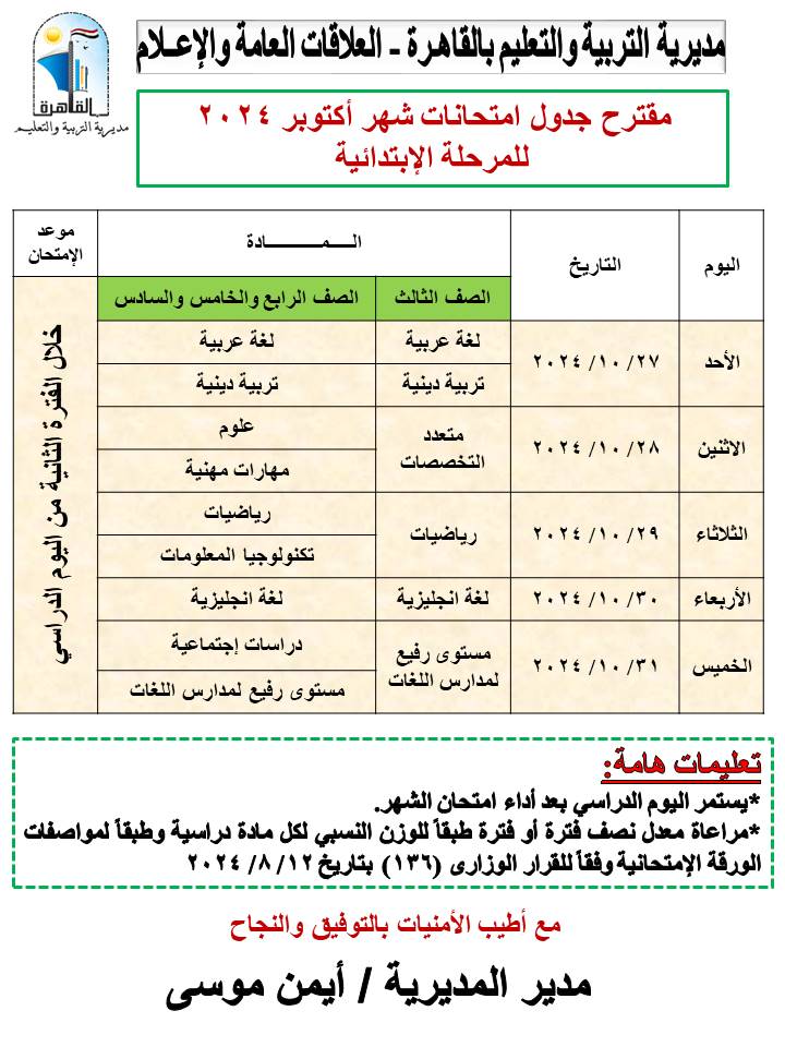 أعلنت مديرية التربية والتعليم بالقاهرة برعاية أيمن موسى، وكيل أول الوزارة، جداول امتحانات شهر أكتوبر للعام الدراسي 2024-2025 للمراحل التعليمية الثلاثة ابتدائى - إعدادي – ثانوي، وذلك اعتبارًا من يوم الأحد الموافق 27-10-2024 حتى يوم الخميس 31-10-2024.
