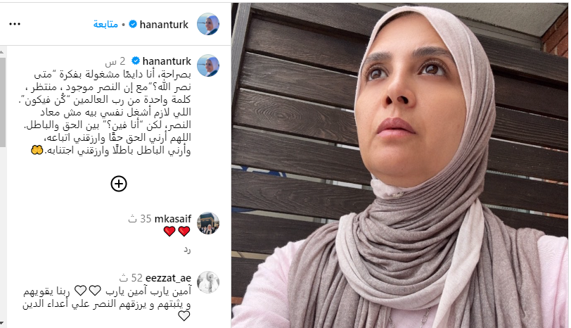 شاركت حنان ترك، صورة لها عبر حسابها الشخصي بموقع انستجرام، وعلقت عليها قائلة: بصراحة، أنا دايمًا مشغولة بفكرة متى نصر الله؟ مع إن النصر موجود ومنتظر، كلمة واحدة من رب العالمين كُن فيكون.