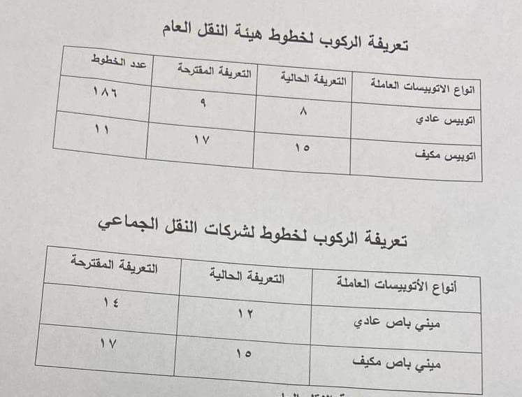 - تعريفة الأجرة الجديدة بين المحافظات