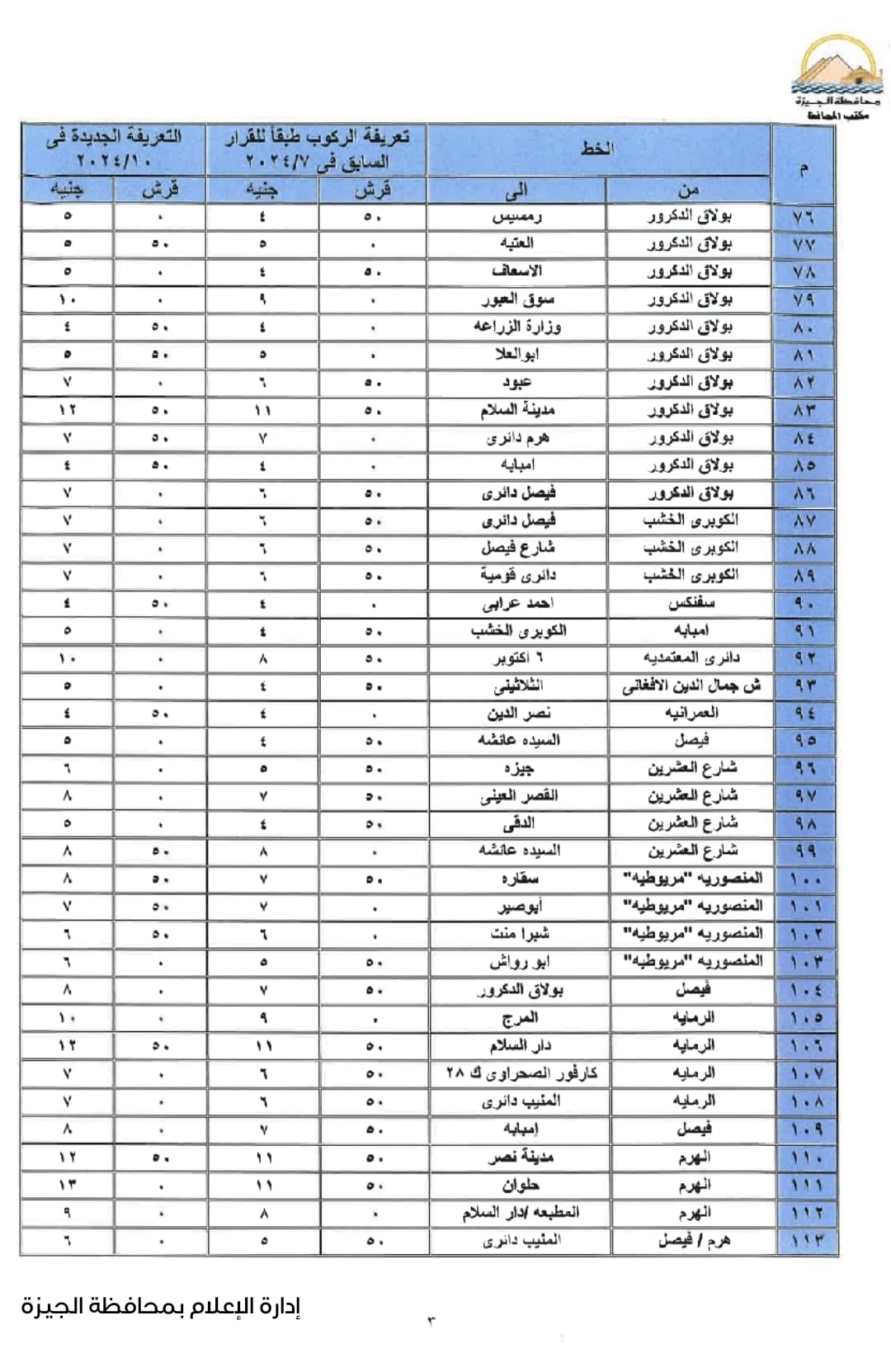 تسعيرة المواصلات الجديدة في محافظة الجيزة