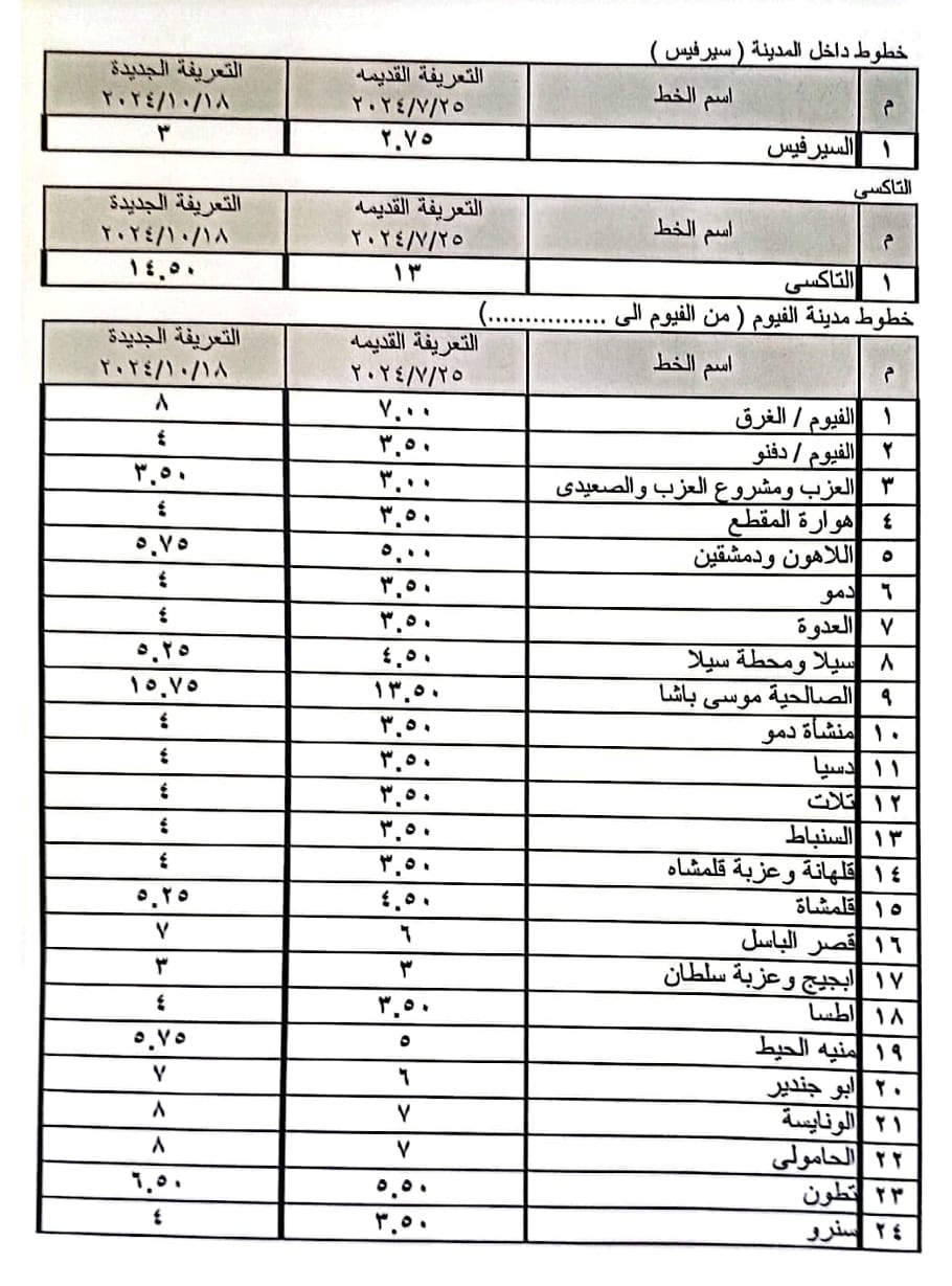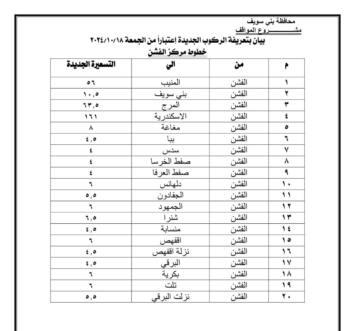 تعريفة المواصلات الجديدة 2024 الفيوم