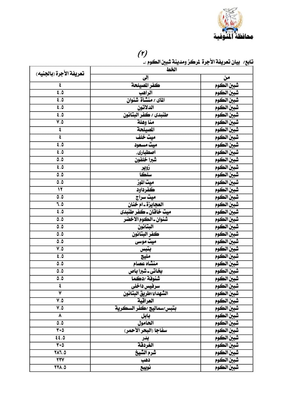 - تعريفة المواصلات الجديدة 2024 المنوفية