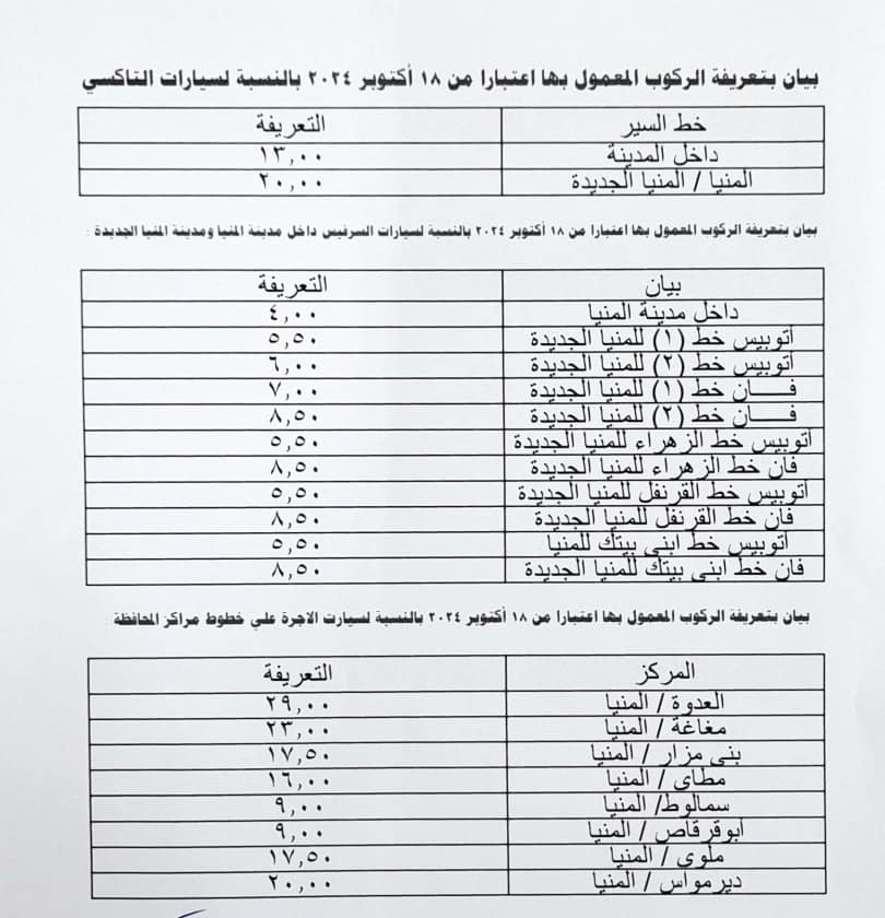 قرر اللواء عماد كدواني محافظ المنيا، اعتماد أجرة المواصلات في محافظة المنيا بدءًا من اليوم الجمعة الموافق 18 أكتوبر الجارى، سواء لخطوط السرفيس الداخلي أو الربط مع المحافظات والأقاليم، كالتالي: