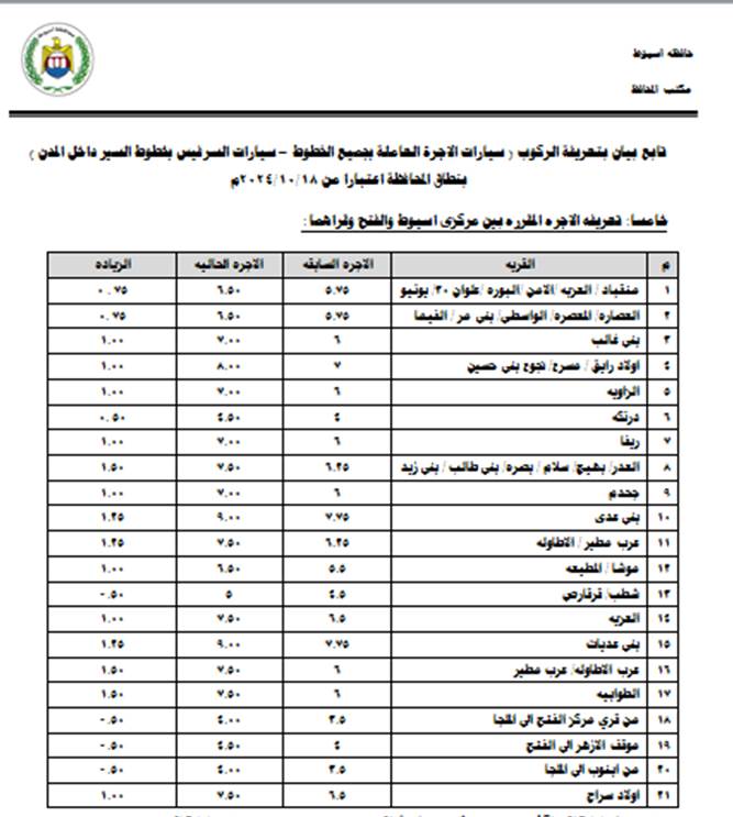 قائمة أسعار المواصلات الجديدة 2024 في محافظة أسيوط