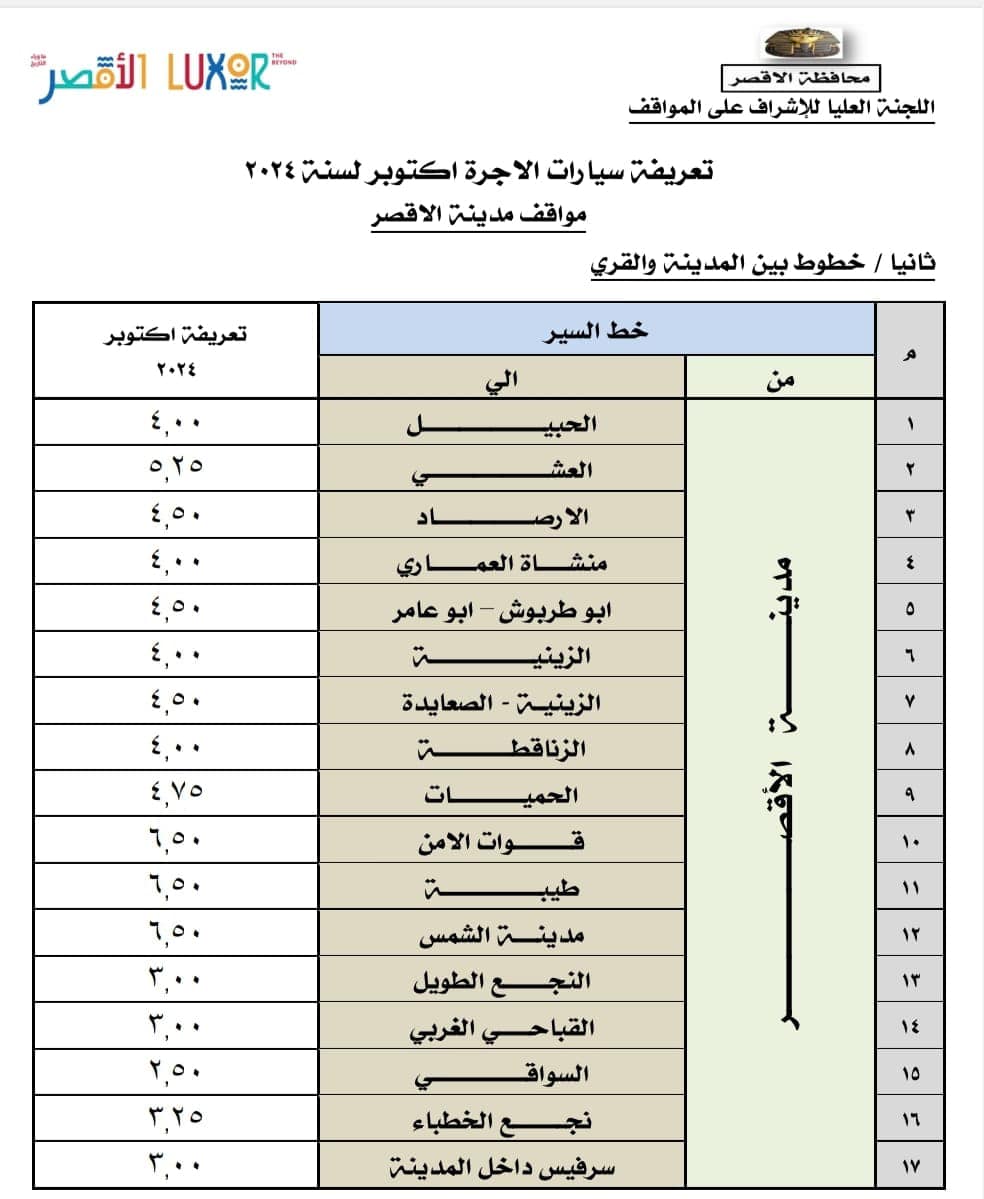 قرر المهندس عبدالمطلب عمارة محافظ الأقصر اعتماد قرار زيادة تعريفة أجرة المواصلات الجديدة في محافظة الأقصر بنسبة تتراوح بين 10% إلى 15% في ضوء قرار لجنة التسعير يتحريك أسعار المنتجات البترولية بكافة الأنواع، حيث جاءت تعريفة ركوب المواصلات الجدية بين مدن المحافظة والمحافظات الأخرى كالتالي:
