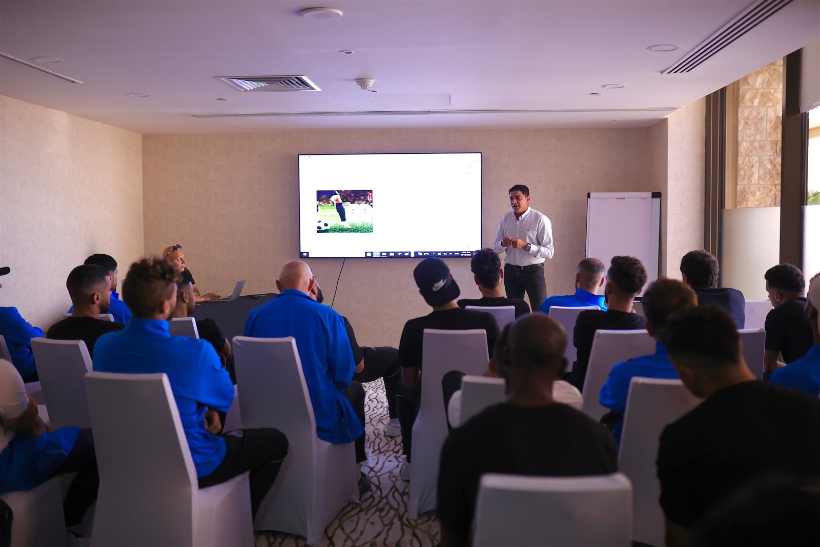 حاضر الحكم الدولي السابق، إبراهيم نور الدين مدير إدارة التطوير بلجنة الحكام باتحاد الكرة، لاعبي فريق نادي بيراميدز، في مقر إقامة البعثة بأبوظبي، قبل مواجهة الزمالك في السوبر.