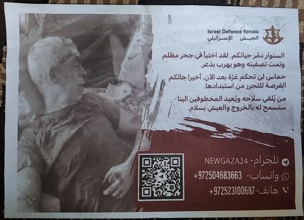 الاحتلال يلقي منشورات فوق غزة تحمل صورة السنوار وكلمات تهديد