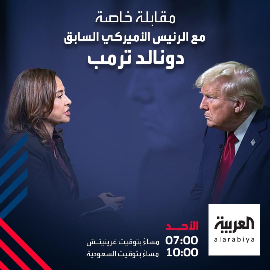 تذيع قناة العربية مساء اليوم السبت، مقابلة خاصة مع الرئيس الأمريكي السابق والمرشح الجمهوري الحالي دونالد ترامب، معلنة أنها ستبث المقابلة مع ترامب، في الساعة 10 من مساء يوم الأحد.