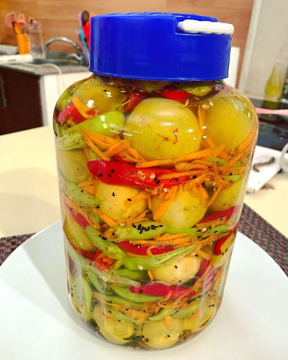 - حركي البرطمان أو رجيه ثم اتركيه في درجة حرارة المطبخ وبعد إتمام التخليل احتفظي به في الثلاجة من السنة للسنة.