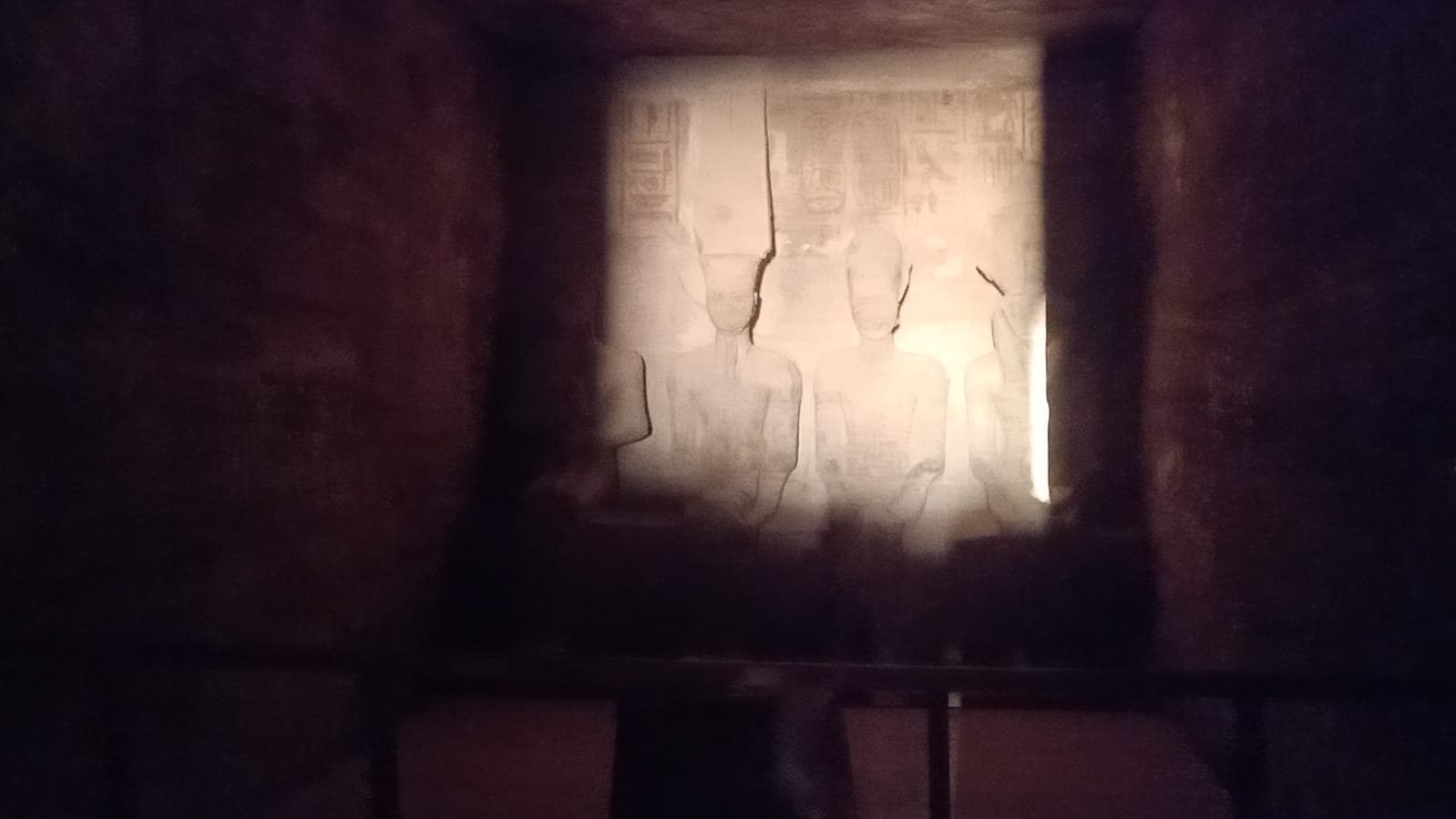وأشار إلى أن هذه الظاهرة أصبحت تتكرر يومي 22 أكتوبر و22 فبراير، وذلك لتغير خطوط العرض والطول بعد نقل المعبد 120 مترا غربا وبارتفاع 60 مترا، حيث تدخل الشمس من واجهة المعبد لتقطع مسافة 60 مترا لتصل إلى قدس الأقداس لتضيء ثلاثة تماثيل من الأربعة الموجودة في داخله صانعة إطارا حول التمثالين بطول 355 سم وعرض 185 سم: وهم تمثال رع حور آختي إله الشمس، وتمثال رعمسيس الثاني نفسه الذي يتساوى مع تمثال الإله، وتمثال آمون سيد طيبة في تلك الحقبة، أما التمثال الرابع للإله بتاح رب منف وراعي الفن والفنانين وإله العالم السفلي فلا تصله أشعة الشمس، لأنه لابد أن يبقى في ظلام دامس مثل حالته في العالم السفلي.