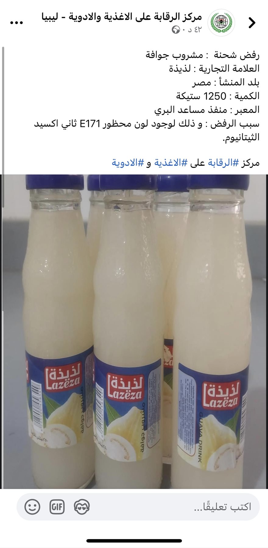 وفي ذات السياق، كشف مركز الرقابة على الأغذية والأدوية الليبي، عن رفض استلام شحنة عصير مانجو من نكتار المصرية.