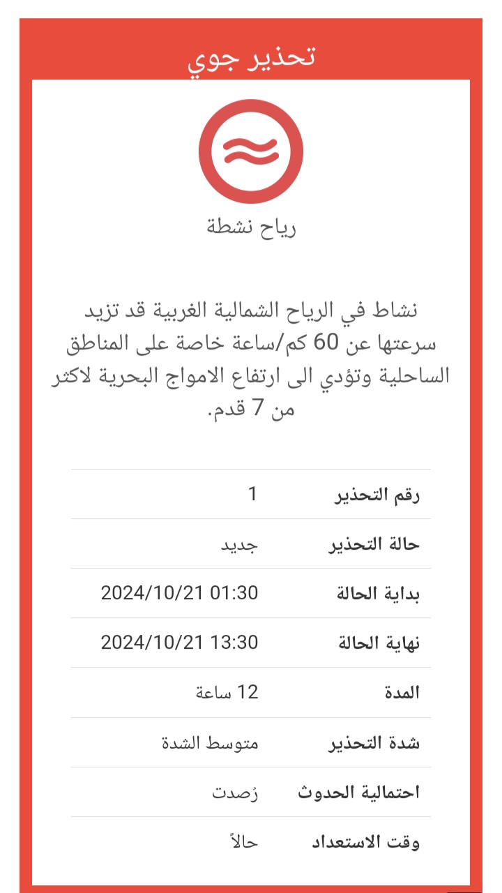 ونظرًا لارتفاع الأمواج وتنشط الرياح، يحذر المركز الوطني للأرصاد جميع مرتادي البحر من مخاطر الغرق، ويطلب منهم توخي الحذر واتباع إرشادات السلامة.