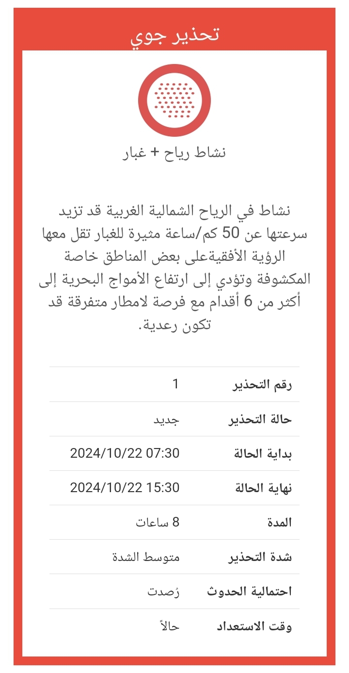 وحذرت الأرصاد من نشاط في الرياح الشمالية الغربية قد تزيد سرعتها عن 50 كم/ساعة مثيرة للغبار تقل معها الرؤية الأفقيةعلى بعض المناطق خاصة المكشوفة وتؤدي إلى ارتفاع الأمواج البحرية إلى أكثر من 6 أقدام مع فرصة لامطار متفرقة قد تكون رعدية.