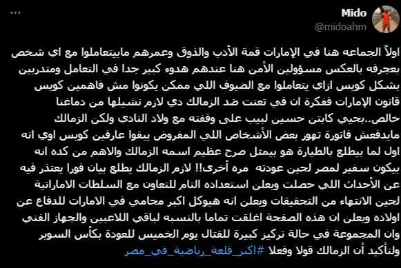 وكتب ميدو على حسابه على موقع x: أولًا الجماعة هنا في الإمارات قمة الأدب والذوق وعمرهم مابيتعاملوا مع أي شخص بعجرفة، بالعكس مسؤولين الأمن هنا عندهم هدوء كبير جدا في التعامل، ومتدربين بشكل كويس إزاي يتعاملوا مع الضيوف اللي ممكن يكونوا مش فاهمين كويس قانون الإمارات، ففكرة أن في تعنت ضد الزمالك دي لازم نشيلها من دماغنا خالص.