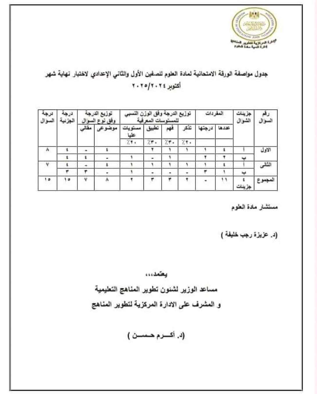 مواصفات الورقة الامتحانية لمادة العلوم للصفين الأول والثاني الإعدادي لامتحان شهر أكتوبر
