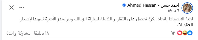 وقال أحمد حسن عبر صفحته الرسمية على موقع التواصل الاجتماعي فيس بوك: لجنة الانضباط باتحاد الكرة تحصل على التقارير الكاملة لمباراة الزمالك وبيراميدز الأخيرة تمهيدا لإصدار العقوبات.