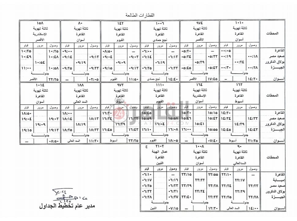 ثانيًا: اعتبارًا من يوم 2024/11/1 يتم وقوف جميع قطارات الثالثة التهوية الديناميكية العاملة على خط القاهرة / أسوان والعكس بمحطة صعيد مصر، وذلك على النحو التالي: