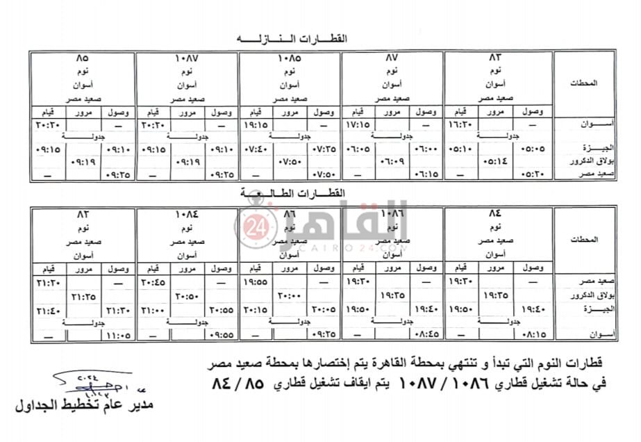 وحصل القاهرة 24 على مستند رسمي صادر عن هيئة السكة الحديد، يتضمن جدول مواعيد وقوف قطارات النوم والروسي تهوية ما بين القاهرة وأسوان بمحطة قطارات بشتيل الجديدة، والتي جرى تشغيلها منذ أسبوعين، حيث جاءت المواعيد كالآتي: