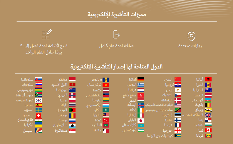 تتاح التأشيرة الإلكترونية لمواطني 66 دولة صالحة لمدة عام كامل على أن تتيح الإقامة داخل المملكة لمدة تصل إلى 90 يوما.