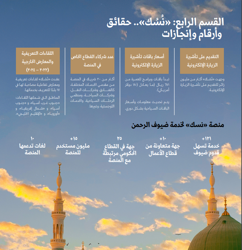 حرصت دائما المملكة العربية السعودية على راحة زوار بيت الله الحرام وسـلامتهم، واهتمامهــا بانتظــام أداء العمــرة، وإتاحتهــا لأكبر عــدد مــن المسلمن القادميـن مــن خارج المملكة العربية السـعودية، لذلك أسست عام 2022 المنصـة الحكوميـة الموحـدة "نسك" لتسهيــــل خدمــات العمــرة والارتقاء بخدمــة قاصدي مكة المكرمة والمدينة المنورة، وأتمتـة رحلتهـم الروحانيـة مـن مجـرد التفكـر في أداء شـعائر العمـرة، وحتى رجوعهـم إلى بلدهـم، مـع إثـراء تجربتهــم الدينيــة والثقافيــة والتاريخيــة، وفــق عمـل منهـي ومؤسسي، وبمـا يتوافـق مـع مسـتهدفات رؤية السعودية 2030 التي تهدف إلى الوصول لـ 30 مليون معتمر.