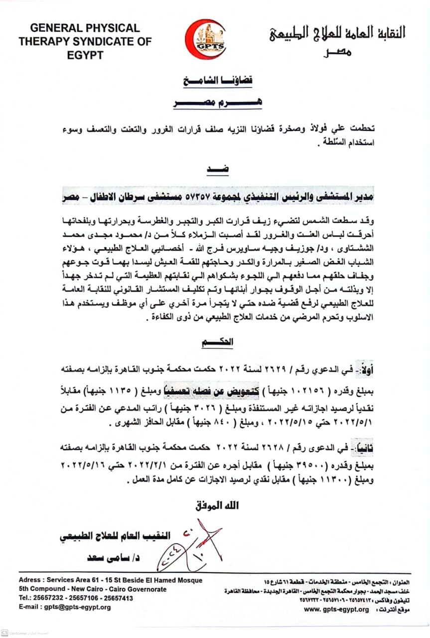 وأشارت نقابة العلاج الطبيعي إلى أنه في قضية أخرى رقم 2628 لسنة 2022، أصدرت محكمة جنوب القاهرة حكمًا لصالح الدكتور محمود مجدي الششتاوي، أخصائي العلاج الطبيعي، بإلزام المستشفى بدفع 39500 جنيه كأجر عن الفترة من 1 فبراير حتى 16 مايو 2022، بالإضافة إلى 11300 جنيه كمقابل لرصيد الإجازات عن فترة عمله بالمستشفى.