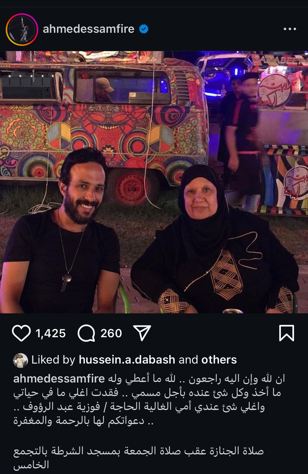ونشر أحمد عصام عبر حسابه الرسمي بموقع تبادل الصور والفيديوهات انستجرام صورة له رفقة والدته وعلق عليها: ان لله وإن اليه راجعون لله ما أعطي وله ما أخذ وكل شيء عنده بأجل مسمي.. فقدت أغلى ما في حياتي وأغلى شيء عندي أمي الغالية الحاجة فوزية عبد الرؤوف.. دعواتكم لها بالرحمة والمغفرة.