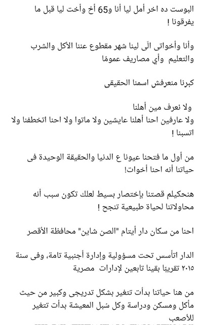 أثار منشور على موقع التواصل الاجتماعي فيس بوك لفتيات دار أيتام الشمس المشرقة بالأقصر استياء مستخدمي السوشيال ميديا بعد قرار نقلهم من الدار، حيث يصل عددهم إلى 65 شابا وفتاة من أبناء الدار ما سيؤدي إلى تشردهم.