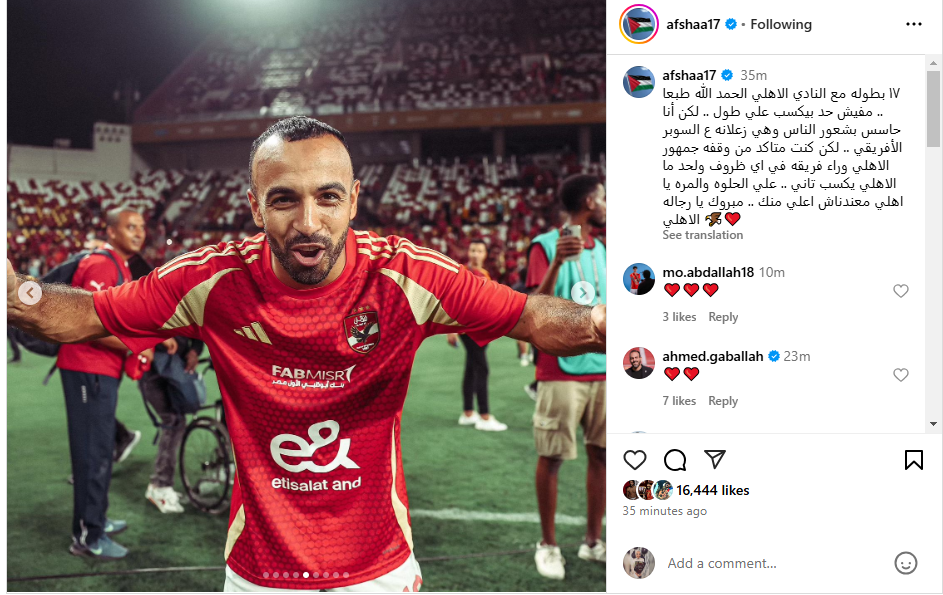 نشر أفشة صور عبر حسابه على انستجرام خلال احتفاله بالسوبر، وعلق: 17 بطوله مع النادي الأهلي الحمد الله، طبعًا مفيش حد بيكسب على طول.