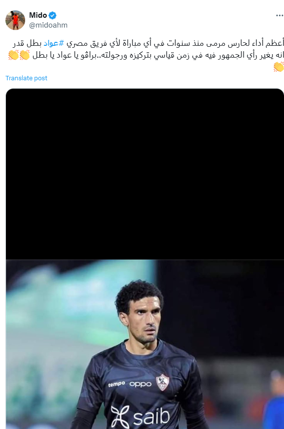 كتب ميدو عبر حسابه الشخصي على إكس: أعظم أداء لحارس مرمى منذ سنوات في أي مباراة لأي فريق مصري، عواد بطل قدر إنه يغير رأي الجمهور فيه في زمن قياسي بتركيزه ورجولته، براڤو يا عواد يا بطل.